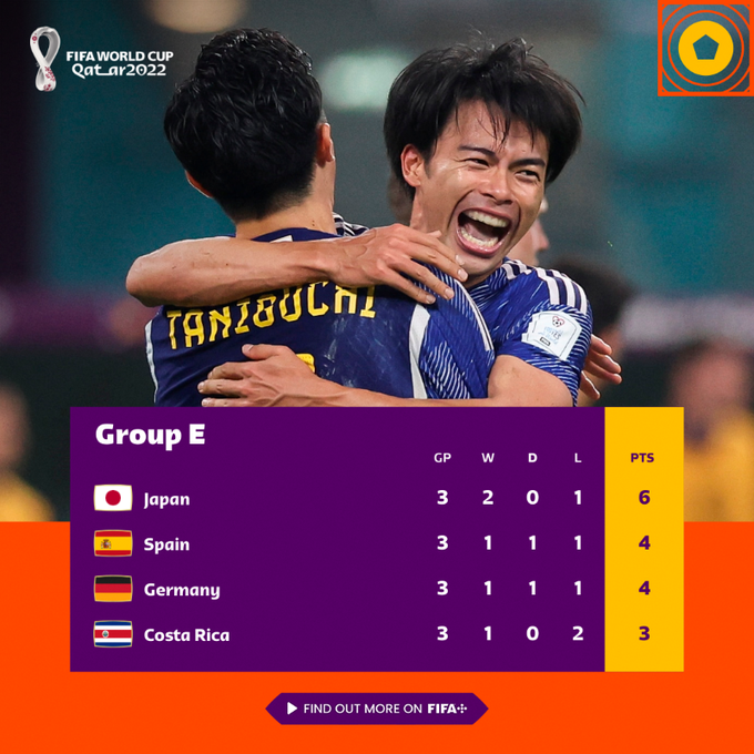 Започна со изненадување, а заврши со изненадување. Фудбалските репрезентации на Јапонија и Шпанија ги освоија првите две места во групата Е на Светското првенство и се пласираа во нокаут фазата на Светското првенство во Катар. Аут се Германија и Костарика.