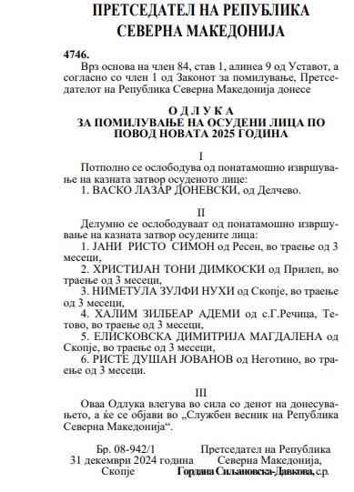 Денес во Службен весник е објавена одлуката на претседателката Гордана Сиљановска Давкова со која се помилуваат седум осудени лица за новогодишните празници. Меѓу помилуваните, нема познати лица, а не се ниту двајцата осудени за 27 април кои како што објави „Слободен печат“ доставиле барање за да бидат помилувани. Од седумте помилувани еден е само потполно помилуван, додека другите шест делумно се ослободуваат од понатамошно извршување на казната затвор.