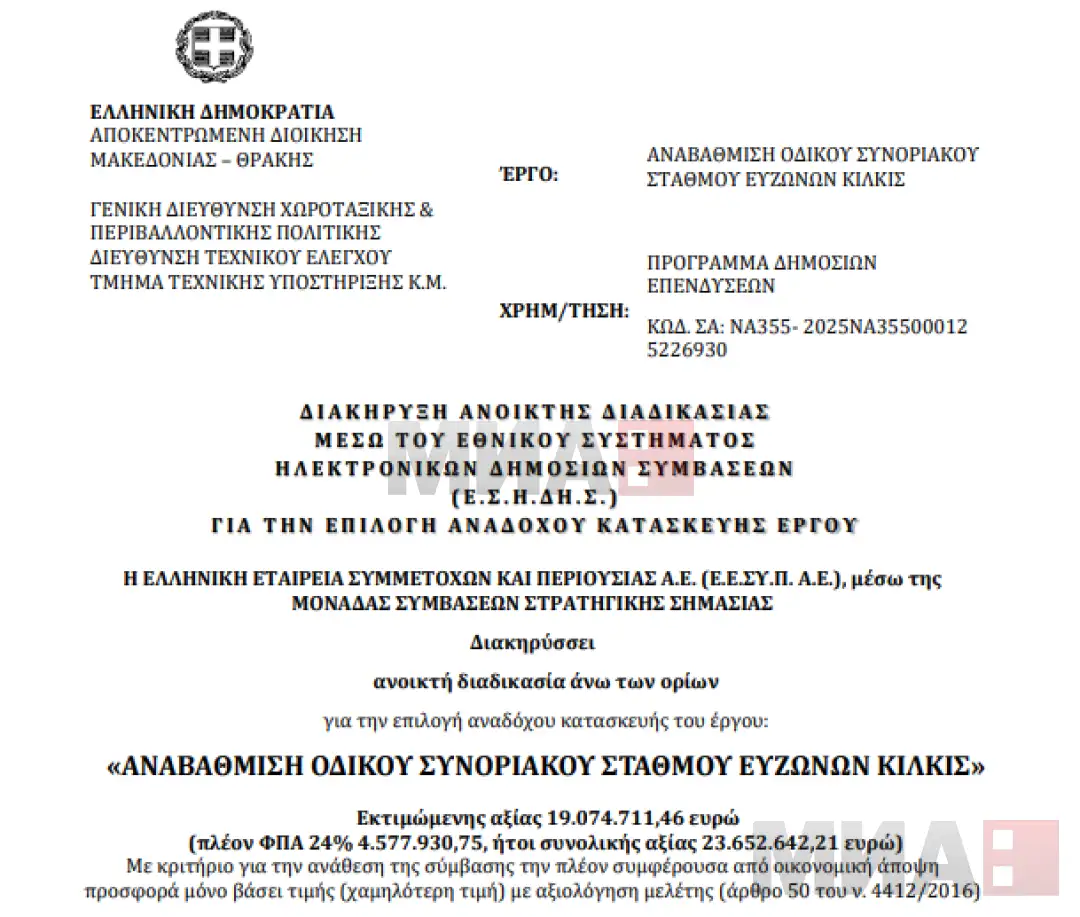 Модернизацијата на грчкиот дел од границата кон нашата земја беше соопштена во втората половина на август со издадена одлуката на грчкиот министер за внатрешни работи Теодорос Ливаниос, а минатата седмица Националниот инвестициски фонд на Грција преку националниот систем за јавни набавки објави тендер за изведувач за проектот „Надградба на копнениот граничен премин Евзони Килкис“ во висина од 23,6 милиони евра.