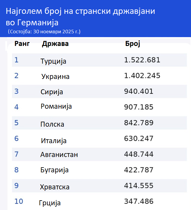 Во Германија живеат повеќе од 14 милиони странци, а Украинците станаа втора најголема група странски државјани, но наскоро би можеле да ги престигнат Турците, кои со децении се на првото место. Според податоците од Централниот регистар на странци (AZR) од 30 ноември 2025 година, во Германија се регистрирани 1,52 милиони турски државјани и повеќе од 1,4 милиони Украинци, објавува FOCUS.