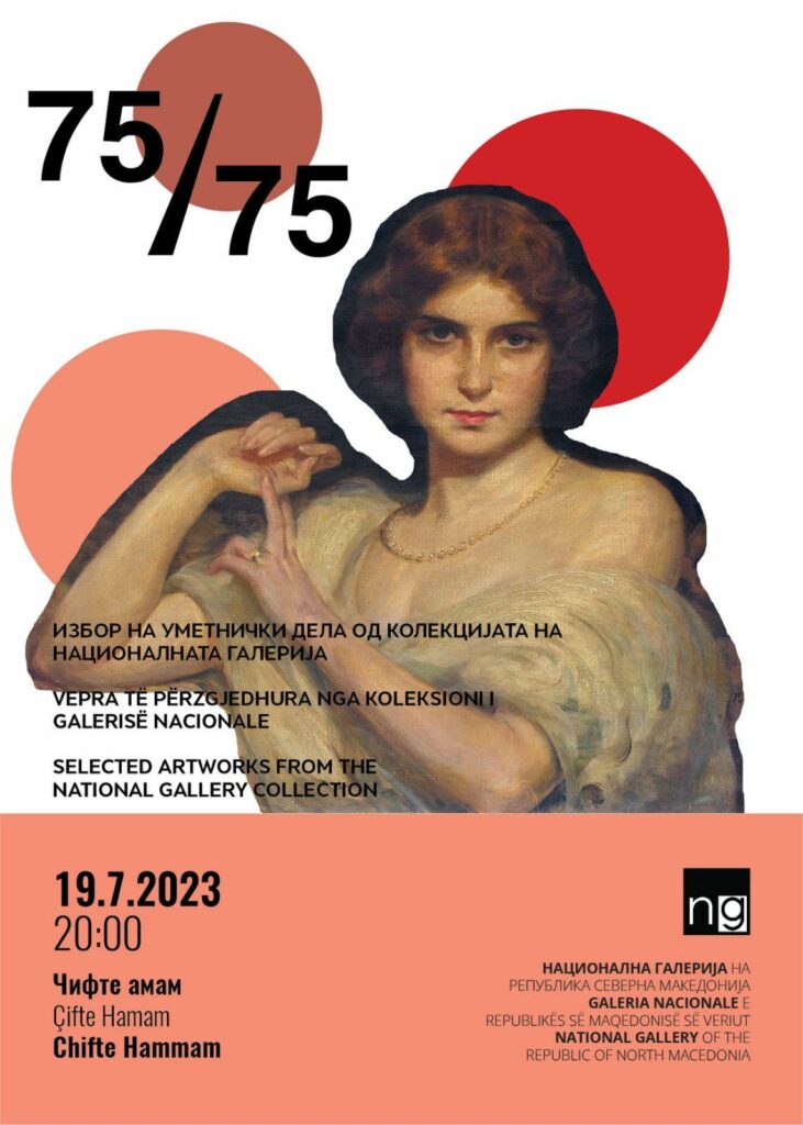 На 19.7.2023 година (среда), во 20 часот, во објектот Чифте амам, ќе биде отворена за јавност изложбата под наслов „75 / 75“. Со оваа изложба ги започнуваме активностите за одбележување на јубилејот 75 години од формирањето на Националната галерија.