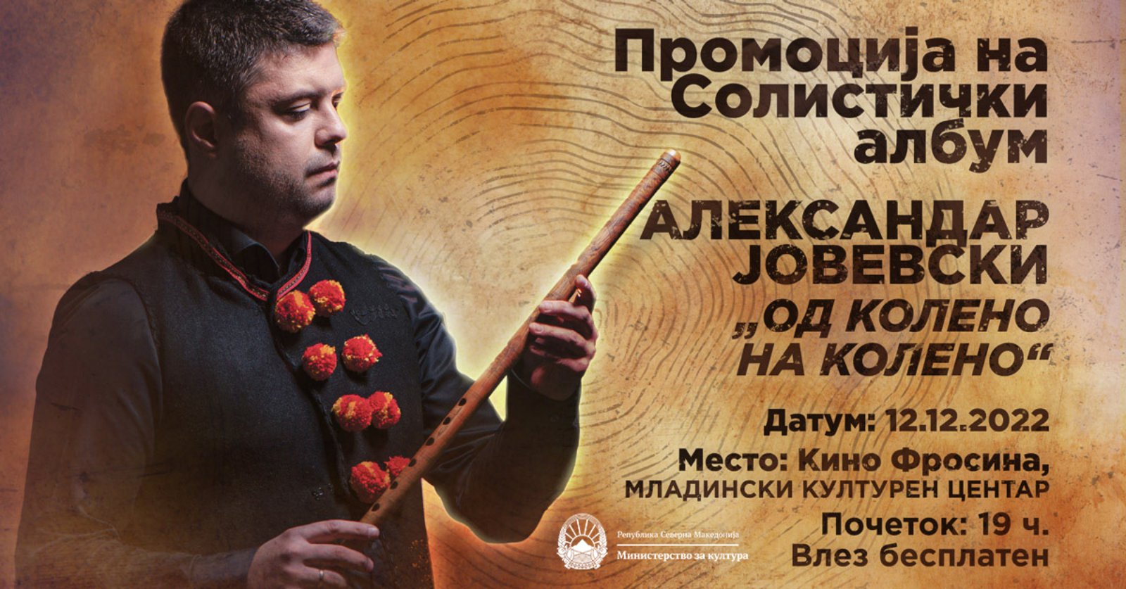 Во понеделник, 12 декември, во 19 часот, во кино Фросина (МКЦ) ќе се одржи промоција на новиот солистички албум на Александар Јовевски ,,Од колено на колено”. На овој музички етно проект (албум) базата е македонскиот фолклор, традиција и идентитет, и е проект од национален интерес во културата.