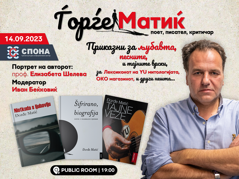Еден од водечките регионални писатели, публицисти, преведувачи… на нашето време, извонредниот Ѓорѓе Матиќ за првпат ќе се претстави во Скопје. Роден е во Загреб во 1970 година, во 1991 година замина во Италија, а потоа во Холандија, а по речиси три децении живот во егзил, сега живее во Пореч.