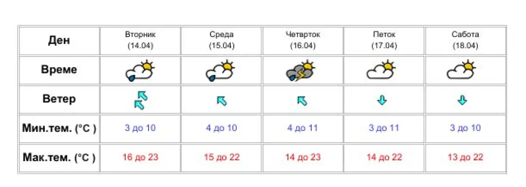 Минималните температури ќе се движат од 3 до 11 Целзиусови степени, а максималните од 14 до 23 степени.