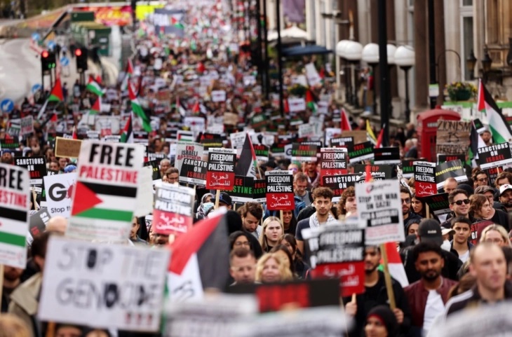 Лондон – Околу 100.000 луѓе се приклучија на денешните пропалестински протести во центарот на Лондон, марширајќи низ британската престолнина и барајќи итен прекин на огнот во Газа по нападот на Хамас врз Израел пред две недели.