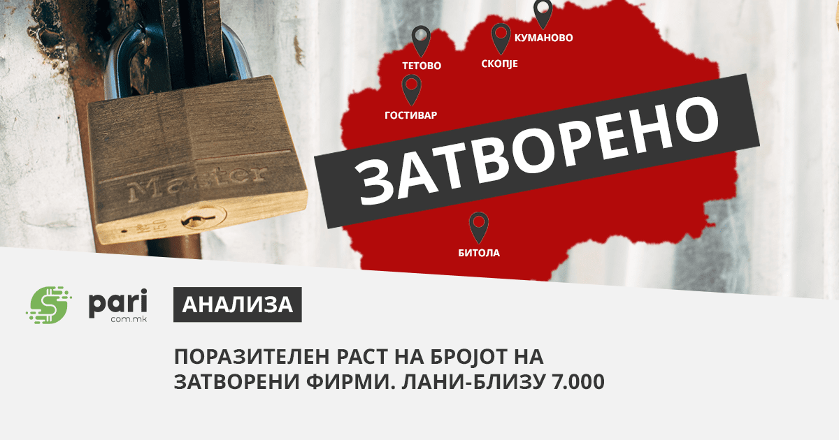 Драстичен раст на бројот на затворени компании минатата година. Податоците говорат дека ланската година била погубна за приближно 7.000 компании или поточно 6.993 фирми ставиле клуч на врата. Во однос на 2020-тата година бројките покажуваат зголемување на бројот на згаснати фирми за дури 782 (во 2020-тата не преживеале 6.211 компании), обелоденуваат податоците од реномираната бизнис платформа БизнисМрежа.мк.