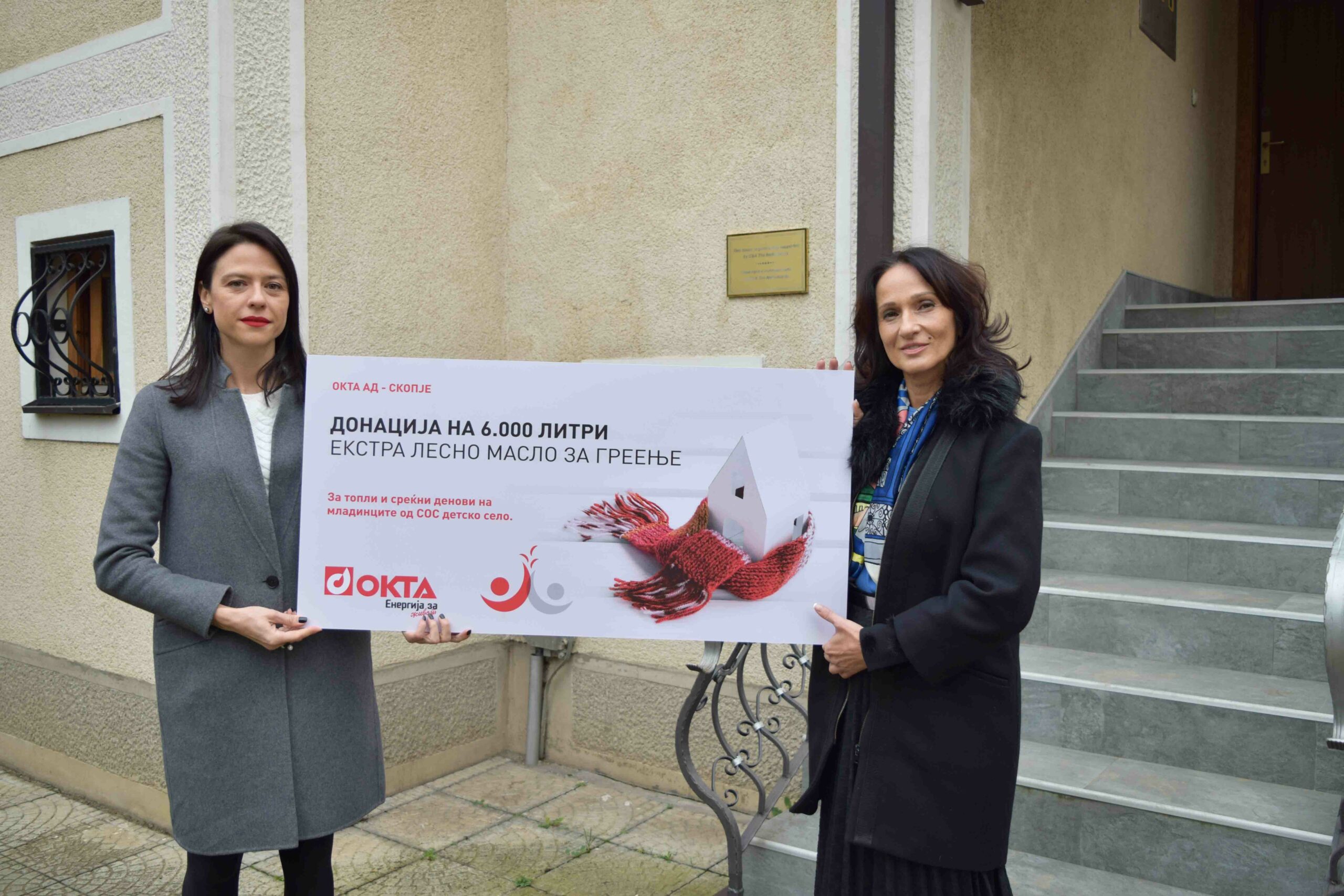 ОКТА АД – Скопје донираше 6.000 литри екстра лесно масло за греење за една од куќитенаСОС Детско село во која живеат млади лица без родителска грижа. Дониранатаколичина на гориво ќе биде доволна целосно да ги покрие потребитеза тековната грејна сезона.