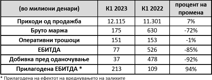 Бруто маржата достигна 175 милиони денари, што претставува намалување од 72% споредено со истиот период од 2022 година, главно поради падот на меѓународните цени на горивата, што доведе до исправка на вредноста на залихите на ОКТА од 8 милиони денари и негативен ефект од нивното вреднување во висина од 128 милиони денари. ЕБИТДА изнесува 77 милиони денари, значајно намалена во споредба со истиот период минатата година, бидејќи на првиот квартал од 2022 година, позитивно влијаеја придобивките од вреднувањето на залихите од 417 милиони денари. Добивката пред оданочување изнесува 37 милиони денари.