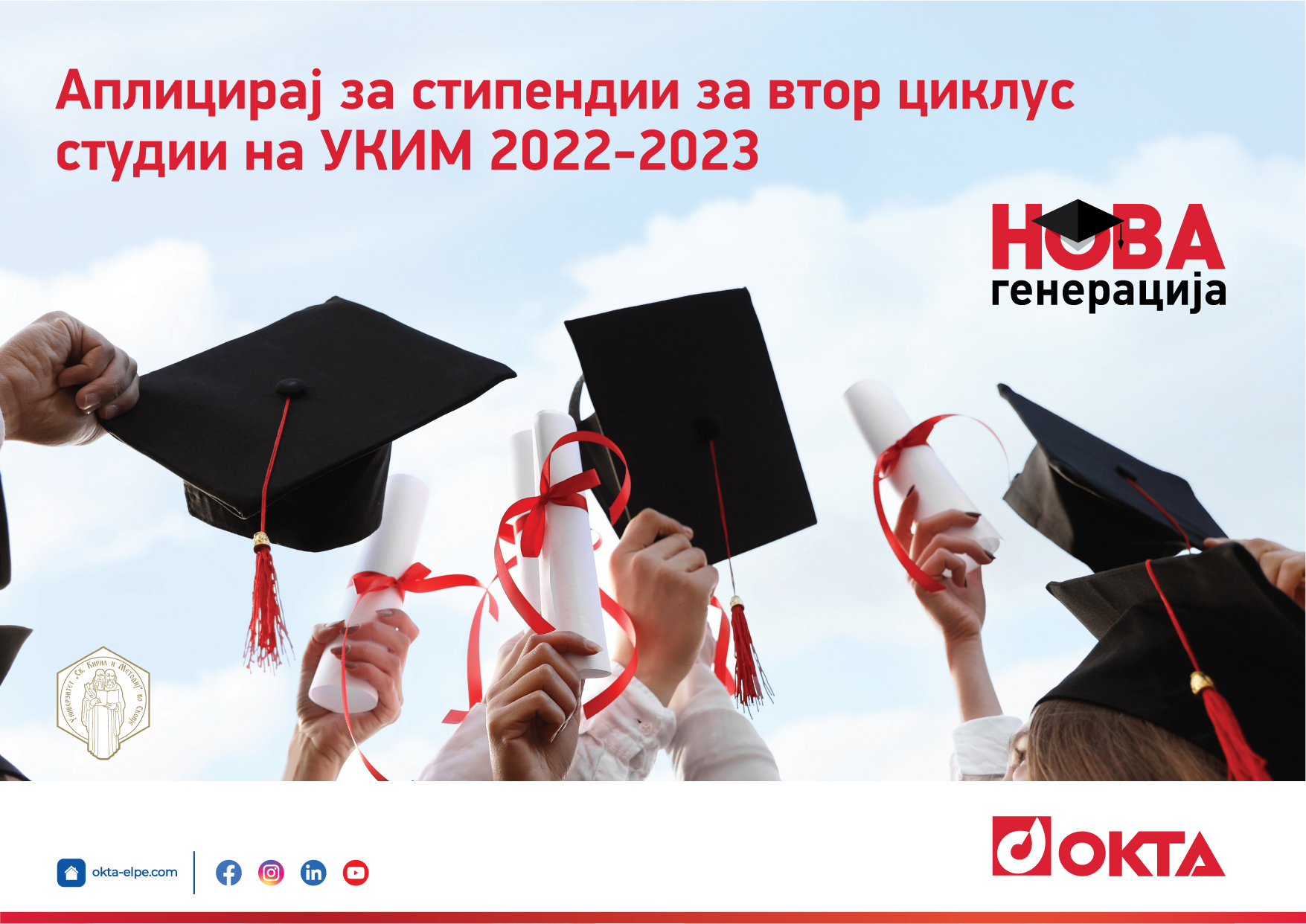 Компанијата ОКТА ќе обезбеди стипендии за петмина студенти од втор циклус студии на Универзитетот „Свети Кирил и Методиј“ (УКИМ) во Скопје, шеста година по ред. Стипендиите ќе бидат доделени на постдипломци од петте факултети кои што имаат наставни програми сродни со дејноста на ОКТА и тоа: Факултет за електротехника и информациски технологии – Скопје, Факултет за информатички науки и компјутерско инженерство, Природно – математички факултет – Скопје (Институт за хемија), Технолошко – металуршки факултет – Скопје и Машински факултет – Скопје. Право на пријавување на конкурсот за стипендирање имаат сите студенти кои што првпат запишуваат втор циклус студии на овие факултети во учебната 2022/2023 година.