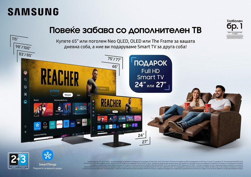 Купувачите кои ќе купат 65-инчен Neo QLED, OLED, The Frame или The Frame Pro телевизор ќе добијат на подарок 24-инчен Full HD Smart TV, додека со купување на 75-инчен или поголем модел следува подарок 27-инчен Full HD Smart TV.