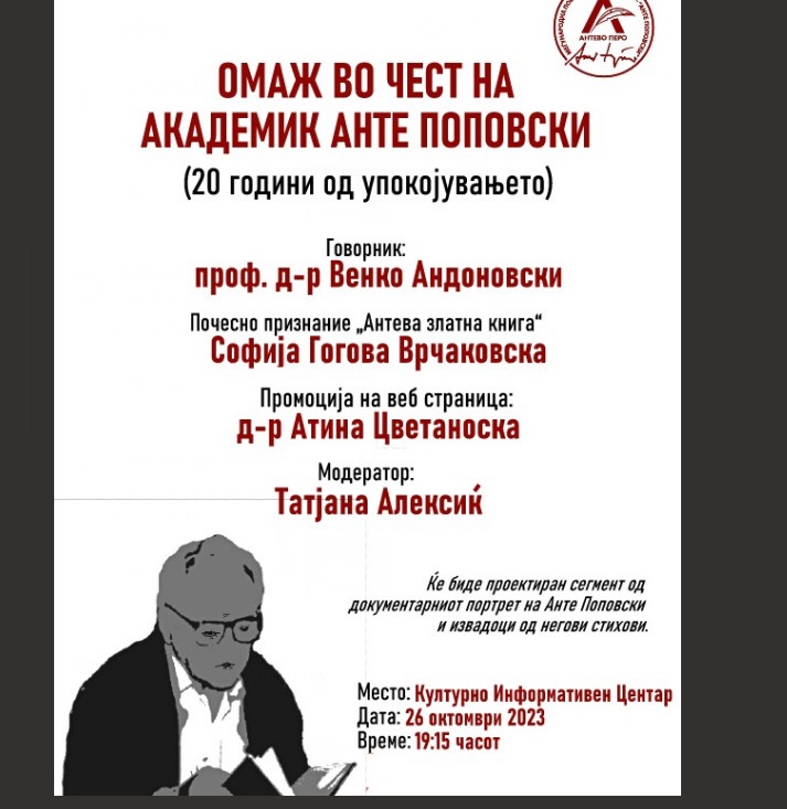 На 26 октомври (четврток), во 19:15 часот, во Културно информативниот центар во Скопје, ќе се одржи Омаж по повод 20-годишнината од упокојувањето на современиот македонски поет, академик Анте Поповски. Настанот е во организација на Здружението за зачувување на делото на Анте Поповски, „Антево перо“ и е составен дел од годинешното шесто издание на меѓународната поетско-културна манифестација што се одржува во чест на македонскиот книжевен великан и го носи неговото име.