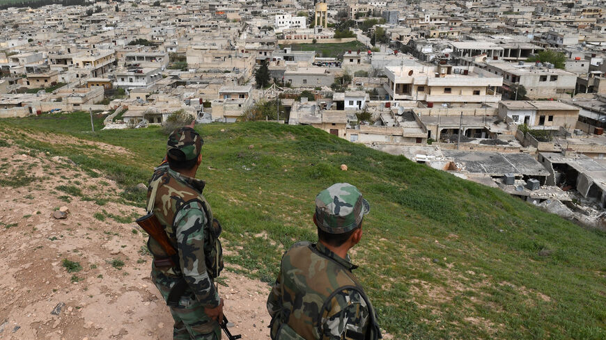 Членови на курдските безбедносни сили Асаиш го гледаа влегувањето на конвојот во градот.