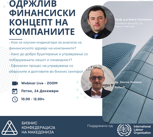 Вебинарот во организација на Бизнис конфедерација на Македонија ќе се одржи на 24.12.2021 (петок) со почеток во 10 часот преку ZOOM платформата. Наменет е за сопствениците, менаџерите и управителите на микро, малите, средните и големите компании а едукативните теми нудат потврдени искуства и знаење за создавање одржлив финансиски концепт и подобра солвентност на компанијата.
