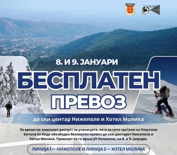 Од Општина Битола информираа дека локалната самоуправа и јавното претпријатие „Пелалинк“ и оваa зима за време на зимскиот распуст за учениците, но и за сите граѓани обезбедија бесплатен превоз до ски центрите на Нижо Поле и „Молика“.