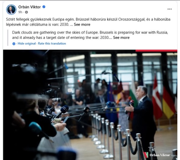 На својата Фејсбук страница, Орбан напиша дека целта на програмата за вооружување што ја покрена Брисел е Европската Унија да биде подготвена за војна до 2030 година, што е и целниот датум за забрзана процедура за членство на Украина во ЕУ, пренесува Хирадо.
