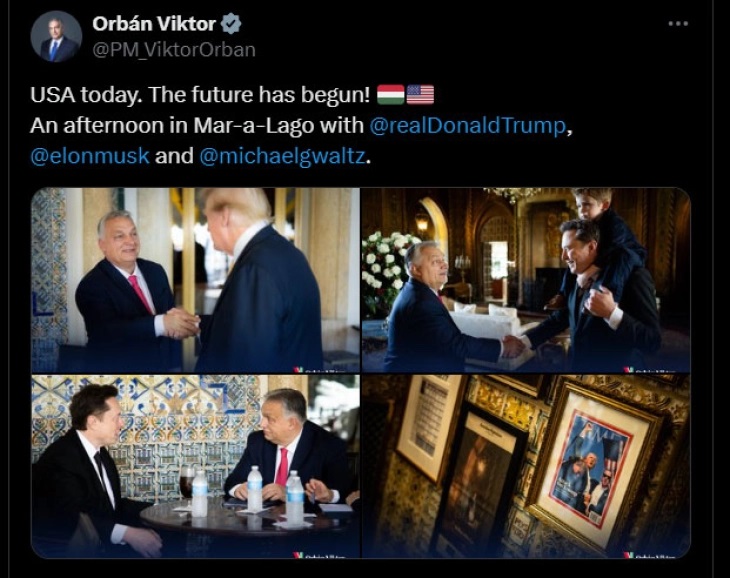 Орландо – Унгарскиот премиер Виктор Орбан се сретна со новоизбраниот американски претседател Доналд Трамп и милијардерот Илон Маск на имотот на Трамп Мар а Лаго во Флорида.