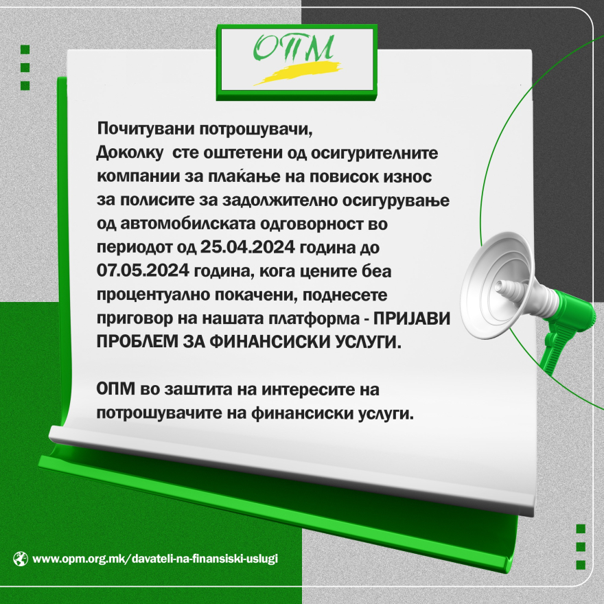 Организација на потрошувачите на Македонија ги повика сите оштетени од осигурителните компании при плаќање на авто-полисите во периодот од 25 април до 5 мај да поднесат приговор.
