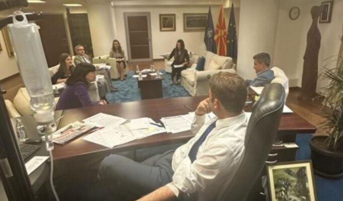 Имено, на фотографијата може да се забележи како министерот при состанок со неколку лица, прима инфузија.