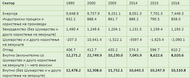Емисиите од секторот Енергија го имаат најголемиот удел – 73.7% во 2016, потоа секторот Земјоделство (без Шумарство и друго користење на земјиште) со удел 11.8%, Индустриски процеси и користење на производи 8.5% и секторот Отпад 6%. Уделот на емисиите од секторот Енергија е доминантен за цело време во временската рамка 1990-2016.