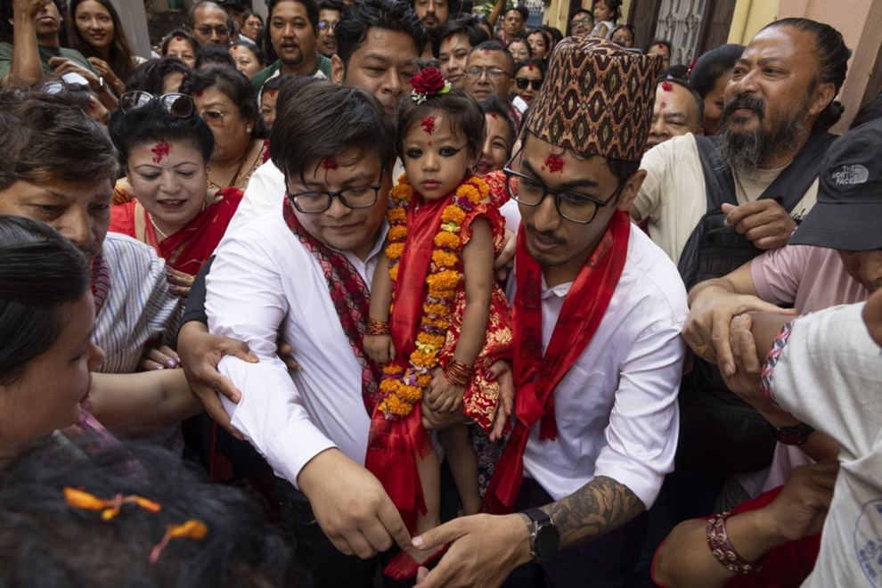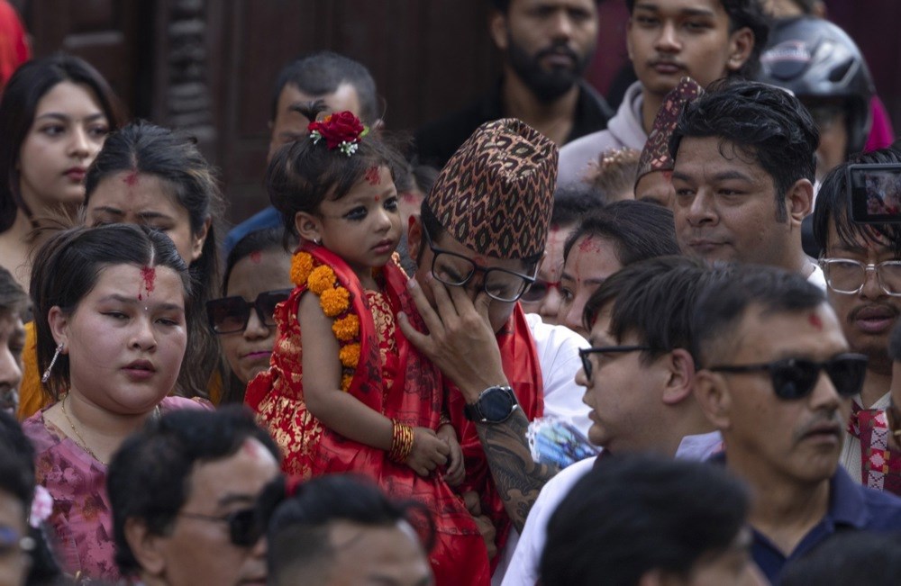Двегодишно девојче е избрано за нова „жива божица“ на Непал, а членовите на семејството ја однесоа од нејзиниот дом до палатата на храмот, во вторникот, за време на најважниот хиндуистички фестивал во земјата.