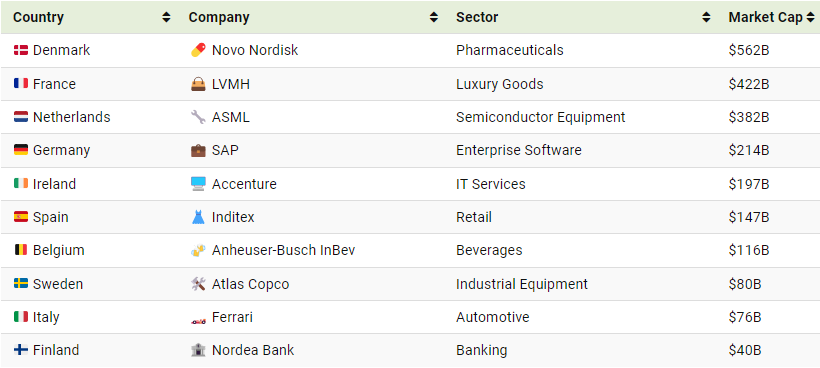 Следниот инфографик ги прикажува највредните корпорации во 11 големи економии на ЕУ, врз основа на нивната пазарна капитализација заклучно со 15 април 2024 година. Сите бројки се добиени од Companiesmarketcap.com.