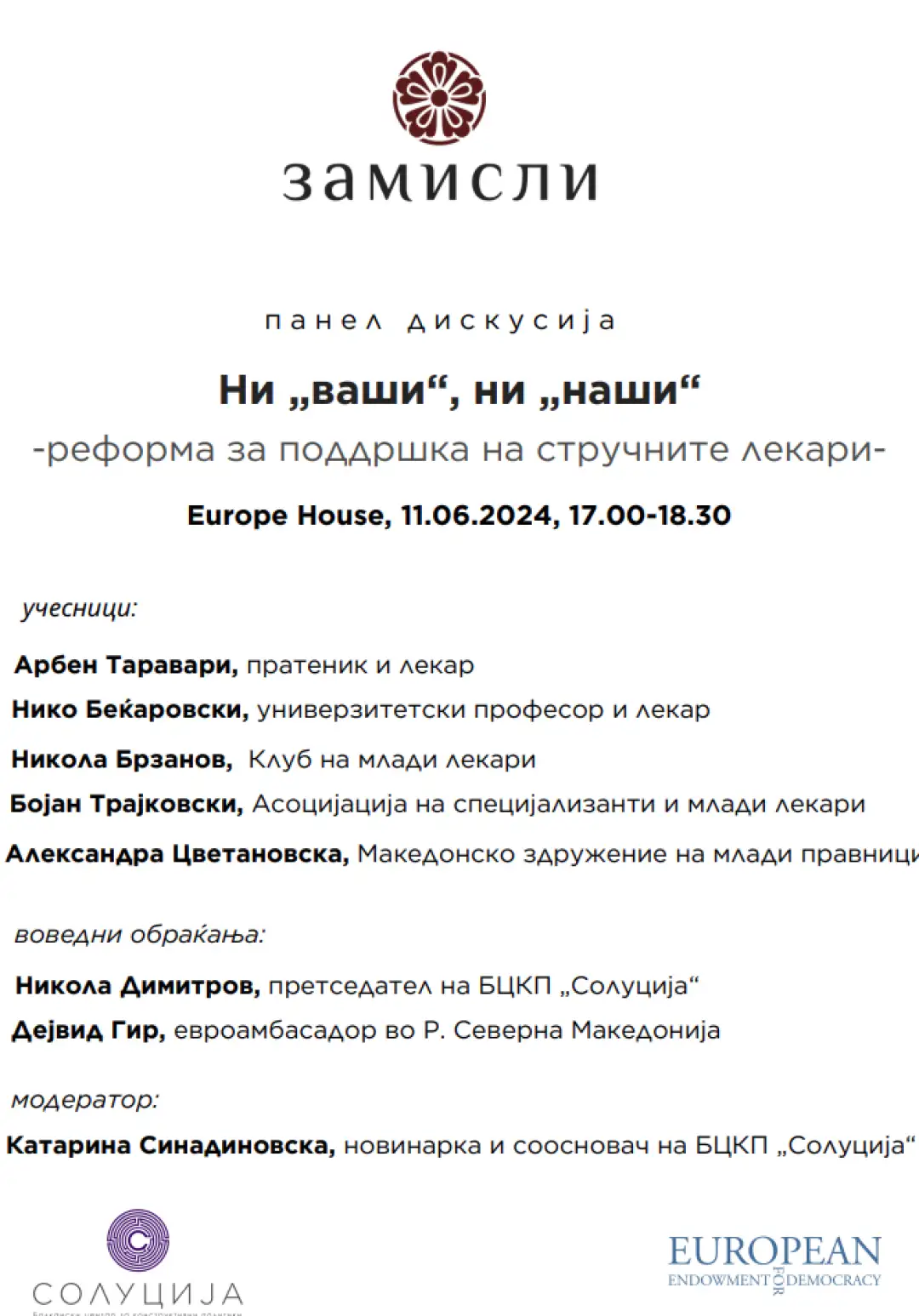 Панел-дискусија насловена „Ни „ваши“, ни „наши“ – реформа за поддршка на стручните лекари“, ќе се одржи попладне во „Европска куќа“ во Скопје.