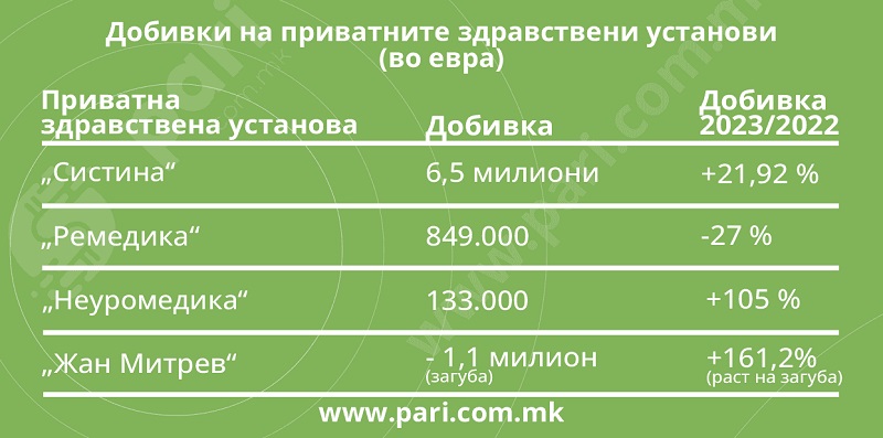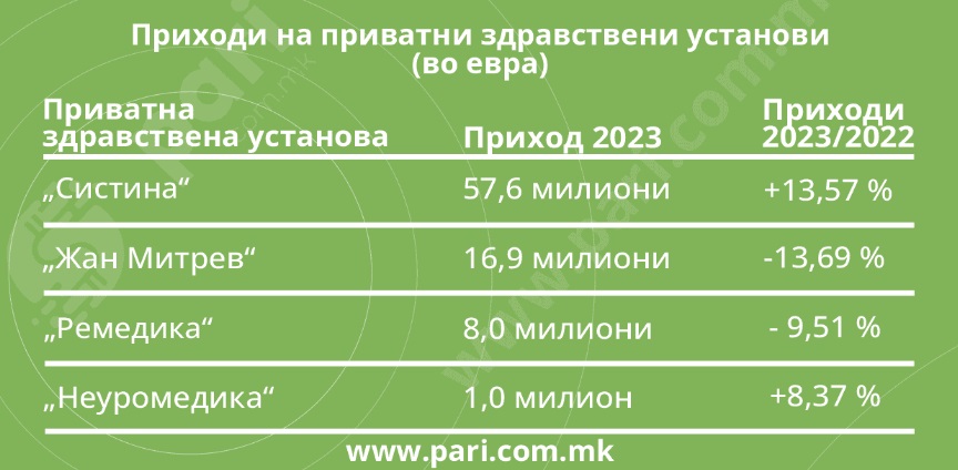 Епилогот е следен: во четирите најголеми приватни здравствени установи – „Аџибадем Систина“, „Ремедика“, „Неуромедика“ и „Жан Митрев клиника“, минатата година граѓаните директно, или преку здравствениот придонес во Фондот за здравствено осигурување за третмани што ги покрива, оставиле 83,5 милиони евра, што е 3,5 милиони евра повеќе отколку во 2022 година, покажува анализата на финансиските податоци што ја направи порталот „Пари“ во соработка со платформата „Бизнис Мрежа мк“.