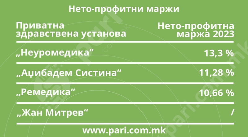 Нето-профитните маржи, всушност, го претставуваат процентот на профитот во вкупниот приход. Тој процент кај „Неуромедика“ бил најголем и изнесувал 13,3%, потоа е „Аџибадем Систина“ со 11,28%, па „Ремедика“ со 10,66%. За „Жан Митрев“ не може да зборуваме за профитна маргина, затоа што болницата воопшто немала профит.