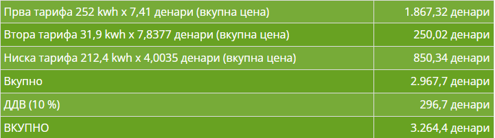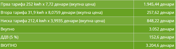 Пресметката е направена врз една реална фактура. Станува збор за потрошена струја за потребите и за затоплување со две инвертор клими за едно тричлено смејство во стан од 60 квадратни метри. Мерењата, според фактурата, се однесуваат за период од 17.11.2022 до 22.12.2022 година. Бидејќи станува збор за поголем пресметковен период од 30 дена, има и проширување на износот во блок-тарифи. Така, ЕВН пресметал повеќе киловати во блок-тарифата број 1, која за 30 дена предвидува потрошувачка од 210 киловат-часови. Во конкретниов случај, во првата тарифа се признати 252 киловати. Во втората тарифа се потрошени 31,9 киловат-часови, а во ниската тарифа 212,4 киловат-часови. Цената за струјата, заедно со нејзиниот пренос и дистрибуција, во конкретниов случај е пресметана 3.052 денари без ДДВ, односно со ДДВ од 5 проценти, сметката е 3.204,6 денари.