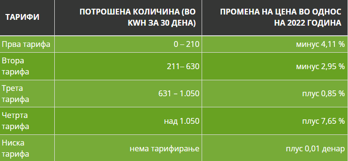 И во 2023 година продолжува да важи ниската, односно евтината тарифа. Во таа тарифа се вбројува потрошувачката на електрична енергија секој работен ден и сабота од 22:00 до 07:00 часот наутро, а во недела евтината тарифа трае во текот на целиот ден, сѐ до понеделник во 07:00 часот наутро.