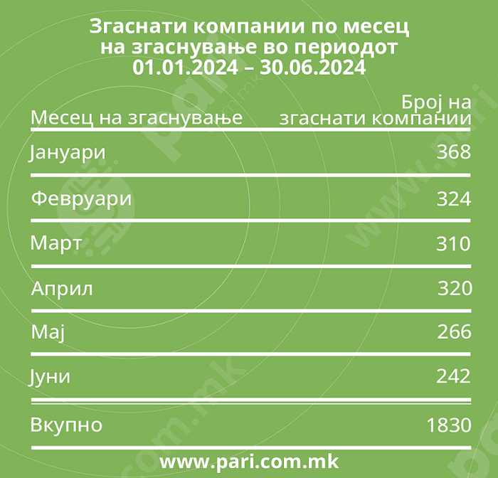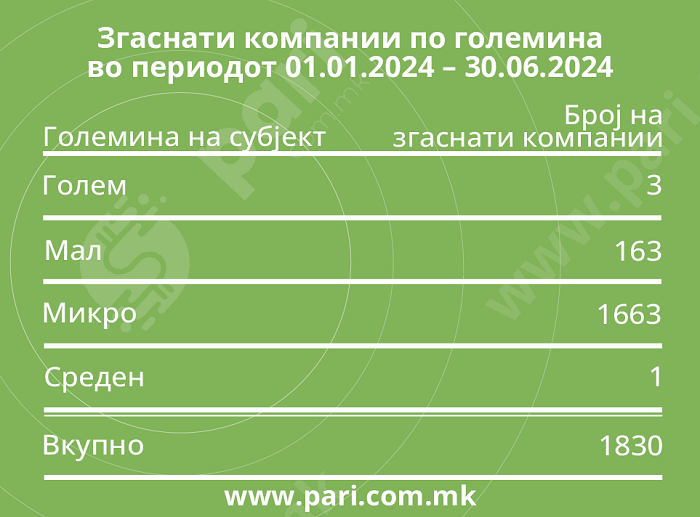 Во првите 6 месеци од годинава 1.830 фирми не успеале да преживеат, од кои 1.663 се микрофирми, кои по дефиниција имаат до 10 вработени и до 50.000 евра бруто годишен приход, покажува анализата на порталот Пари врз основа на податоците од Бизнис Мрежа.мк.
