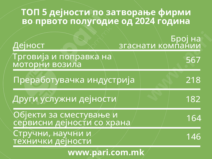 Пари веќе со години ги анализира и затворените и отворените компании, а заклучокот е дека секторот трговија и поправка на моторни возила е најфреквентен. Во овој сектор најмногу ја гледаат својата иднина малите стопанственици, но таму и најчесто ја губат битката. Во првите 6 месеци од годинава во овој сектор се затвориле 567 трговци, или 31 насто од сите затворени компании.
