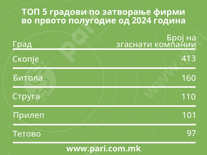 Во досегашните анализи на Пари, Прилеп не беше препознатлив во листите на ТОП 5 градови по затворени фирми, но во првото полугодие од годинава и тој се најде на оваа листа – на четвртото место – со 101 затворена компанија.