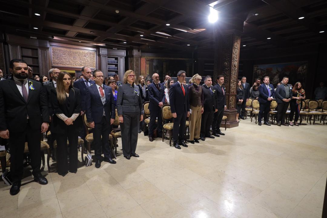 – На патот на тие обиди, проследени со невидена бруталност, на првата линија на отпорот, веќе десетина години, стои херојскиот украински народ поднесувајќи огромна жртва и покажувајќи истрајност и постојана верба дека доброто може да го победи злото. Затоа, војната за слобода којашто Украина ја води денес е за праведна кауза, во името на сиот демократски и цивилизиран свет, којшто мора да продолжи да помага сè до целосно ослободување на Украина, просто затоа што во таа борба, сите ние, немаме право на пораз, потенцира Пендаровски.