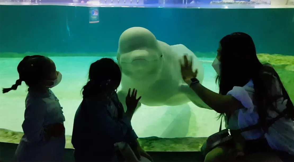 Во резервоар од 1.224 тони, длабок 24 стапки, триото често беше предмет на селфи на посетителите на TikTok, видени како нуркаат и се вртат наоколу во луминисцентната сина вода. Китовите понекогаш игриво пливаа до галерија за гледање за да ги проверат посетителите, многу мали деца кои стоеја на стаклените ѕидови на резервоарот, надевајќи се дека ќе го привлечат вниманието на китовите.