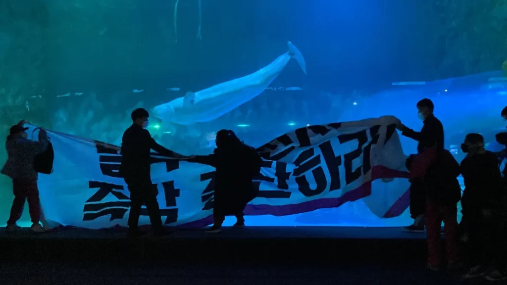 Пуст резервоар со бетонски ѕидови и вештачки карпи, сместен на долните катови на јужнокорејски мега трговски центар, е дом на женскиот кит белуга речиси една деценија.