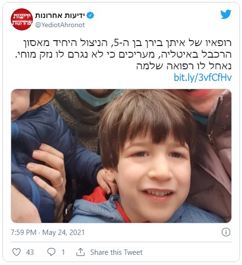 Неговите родители и братчето загинаа во несреќата. Според израелските медиуми, неговата тетка била со него кога се разбудило.