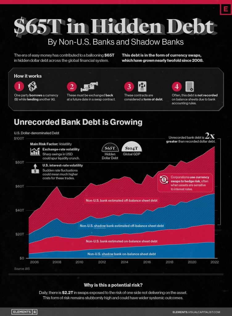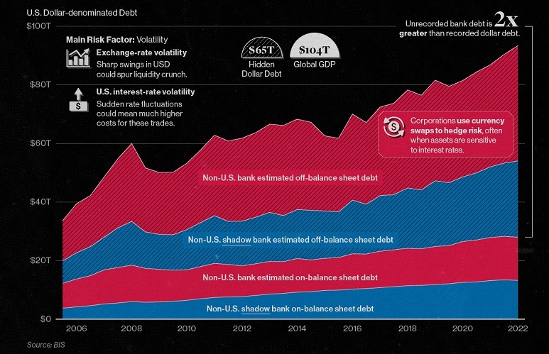 Овој доларски долг е во форма на девизни свопови, кои експлодираа во текот на последната деценија поради долгогодишното монетарно олеснување и ултра ниските каматни стапки, додека инвеститорите бараа повисоки приноси. Денес, неевидентираниот долг од овие девизни свопови вреди повеќе од двојно повеќе од долгот во долари што е официјално евидентиран на билансите на овие институции.