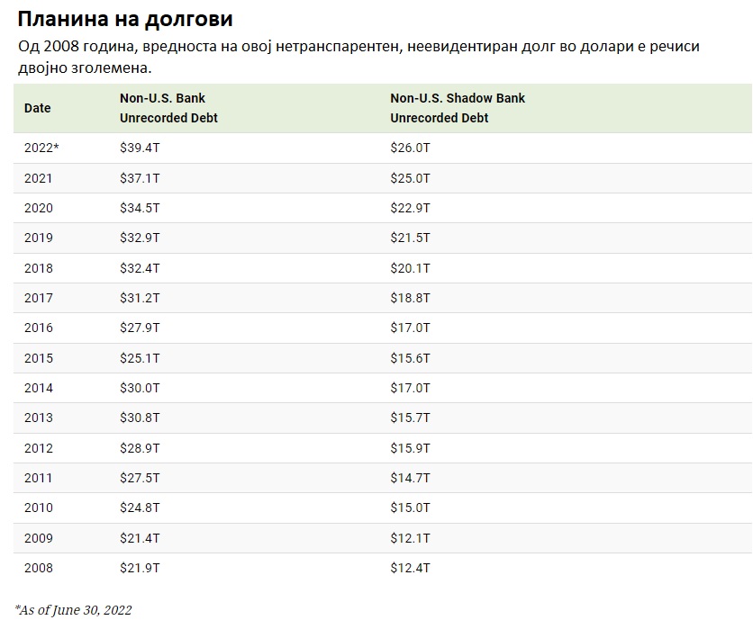 Обемот на скриените долгови низ светот е огромен. Не помалку од 65 билиони долари (65 илјади милијарди) неевидентиран долг циркулира низ глобалниот финансиски систем во банки што не се во САД и банки во сенка. За споредба, глобалниот БДП е проценет на 104 билиони долари.