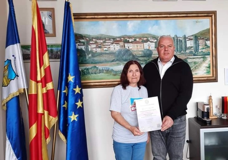 Планинарката Мира Симоновски, која на 74 години го искачи Килиманџаро, на прием кај делчевскиот градоначалник Трајковски