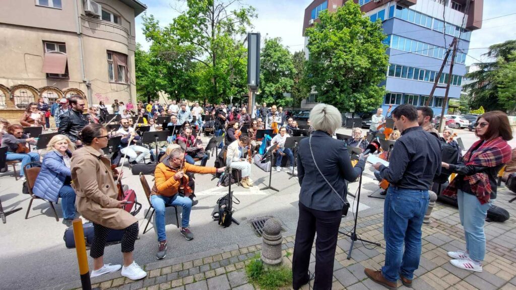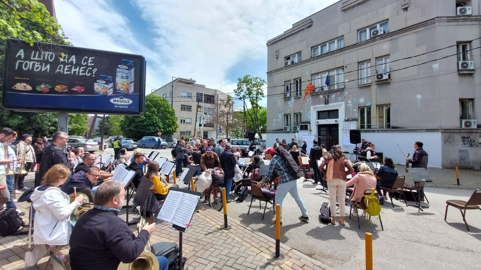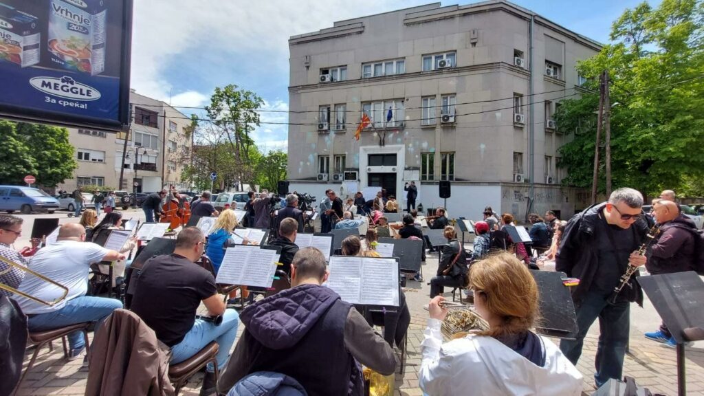 Денеска, Македонската филхармонија одржа протест со своевиден концерт пред Министерството за култура по повод одлуката новоформираната национална институција Џез оркестар на Р.С. Македонија привремено да биде сместена во објектот на НУ „Филхармонија“. Настапија со репертоар на познатии композиции од Џон Вилијамс, Бетовен…