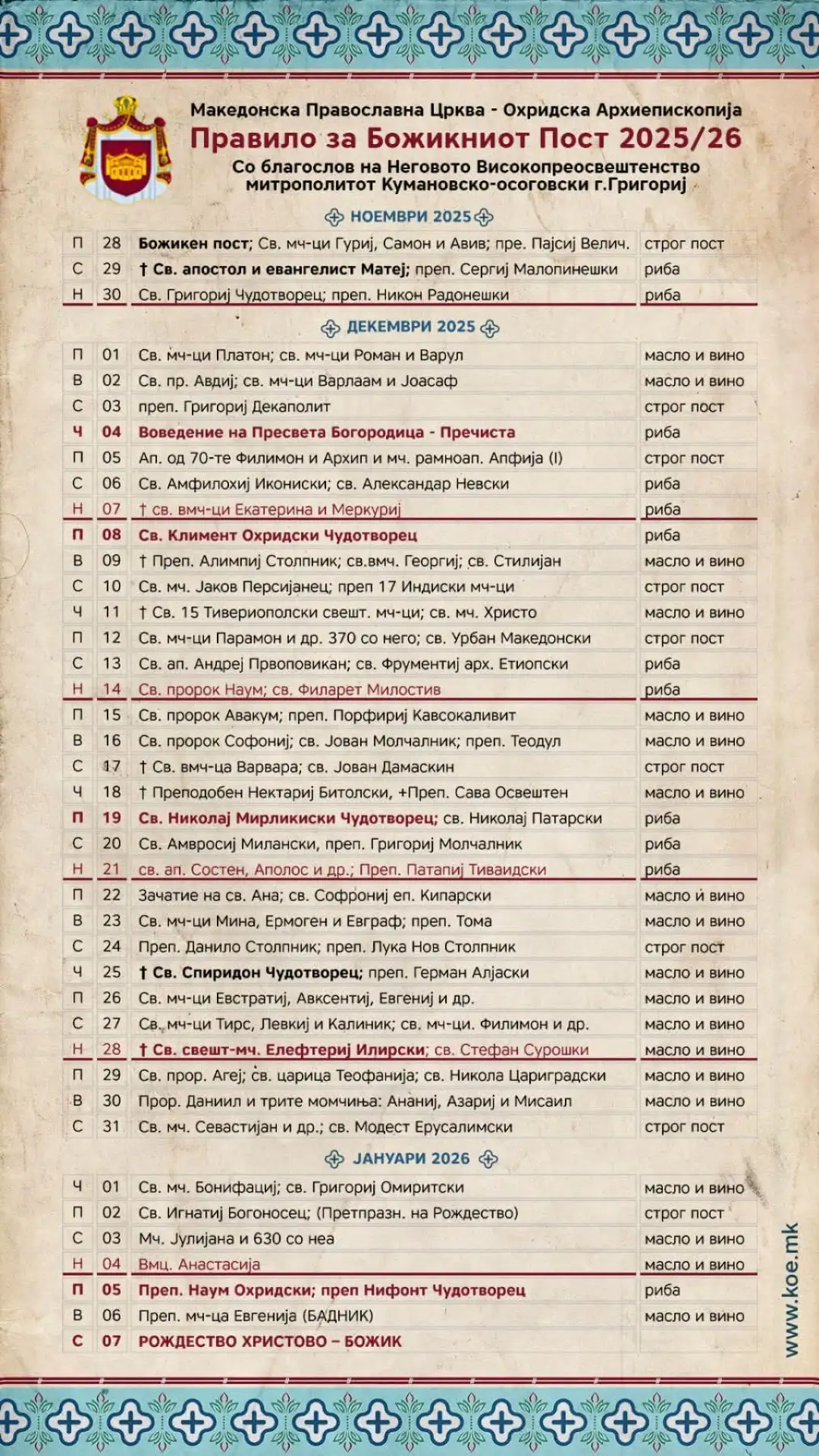 За православните христијански верници кои се водат според јулијанскиот календар денеска почна шестнеделниот божикен пост. Постот ќе трае 40 дена, односно до Божик, 7 јануари, денот на раѓањето на Исус Христос. Бидејќи датумот на Божик не се менува, постот секоја година почнува на 28 ноември, а завршува на Бадник, 6 јануари.