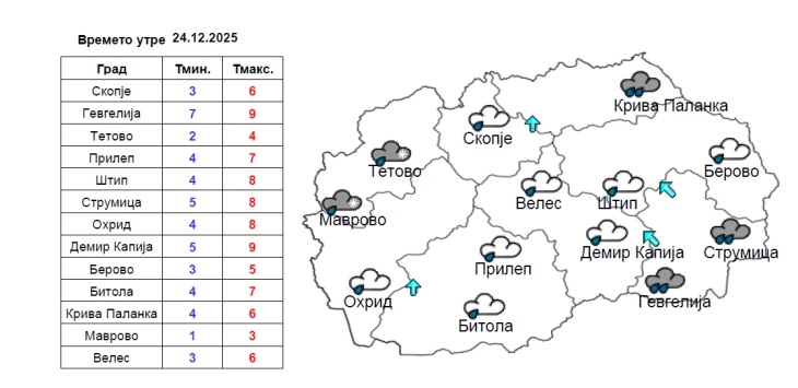 Поради спуштање на постуден воздух од север, во четврток врнежите од дожд ќе преминуваат во снег и на некои од повисоките места. Од петок ќе има стабилизирање на времето.