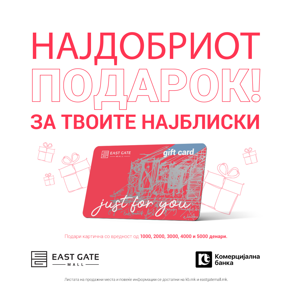 „Ист Гејт подарок-картичката“ е достапна во вредност од 1.000, 2.000, 3.000, 4.000 и 5.000 денари, со цел да биде вредна за дарување во секоја прилика и со најразличен повод, и може да се набави во сите експозитури на Комерцијална банка. Подарок картичката е прифатена од бројни продавници во Ист Гејт Мол, односно најпознатите брендови од светот на модата, козметиката, технологијата и спортот. Може да се користи во период од шест месеци од денот на нејзиното купување и да се троши повеќекратно во тој временски период, на различни продажни места. Сите детали за картичката и листата на продажни места каде што може да се користи се достапни на следниот линк: https://eastgatemall.mk/east-gate-podarok-karticka/ и https://kb.mk/gift-egm.nspx.