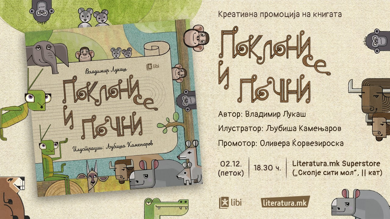 Новата книга за деца „Поклони се и почни“, со текст на Владимир Лукаш и илустрации од Љубиша Камењаров, ќе биде промовирана на втори декември (петок), во 18:30 часот, во книжарницата „Литература.мк суперстор“ во „Скопје сити мол“. Промоторка на сликовницата, која е во издание на „Либи“, дел од „Арс Ламина – публикации“, ќе биде уредничката Оливера Ќорвезироска. Настанот ќе почне со работилница за деца, инспирирана од ликовите во книгата.