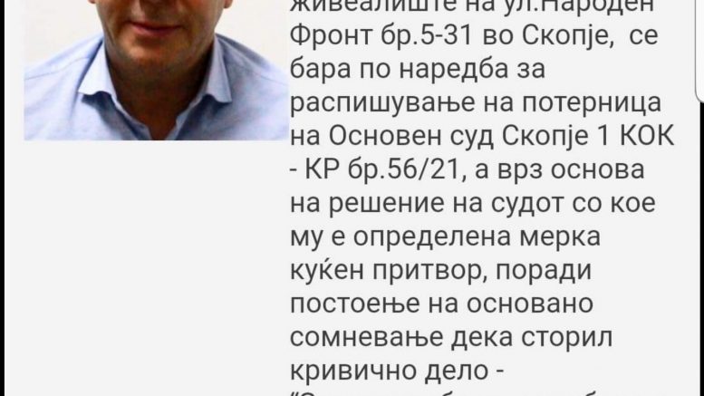 На барање на обвинителството Кривичниот суд издаде решение за куќен притвор за Сашо Мијалков. Полицијата од вчера попладне го бара во неговиот стан во Капиштец, куќата на Водно и во хотелот „Мериот“. Мијалков последен пат бил виден околу 14 часот во кафулето „Дистрикт“, во близина на хотелот „Мериот“. Иако не го нашле дома, според некои медиуми во домот на Водно бил неговиот телефонски апарат, чиј сигнал бил следен. Тој бил следен на јавен простор, како што било законски допуштено, но воедно бил следен и сигналот на неговиот телефонски апарат, кој водел од хотелот „Мериот“ до домот на Мијалков на Водно.Врз основа на телефонскиот сигнал се верувало дека Мијалков е дома, но на крајот се испоставило дека возилото со кое патувал телефонот не било управувано од Мијалков, туку од друго лице или лица, чиј идентитетот првично не можел да се утврди поради блиндираните прозорци.