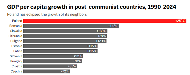 Тоа е историски скок од посткомунистичките урнатини од 1989-90 година до европски шампион за раст, за кој економистите велат дека има лекции за тоа како да се донесе просперитет на обичните луѓе – и за кој администрацијата на Трамп вели дека треба да се препознае со присуството на Полска на самитот на Групата 20 водечки економии подоцна оваа година.