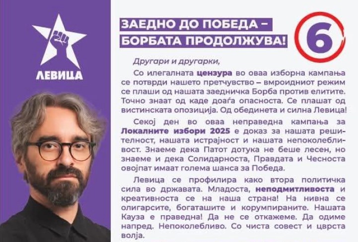 „Со илегалната цензура во оваа изборна кампања се потврди нашето претчувство – вмроидниот режим се плаши од нашата заедничка борба против елитите. Точно знаат од каде доаѓа опасноста. Се плашат од вистинската опозиција. Од обединета и силна Левица“.