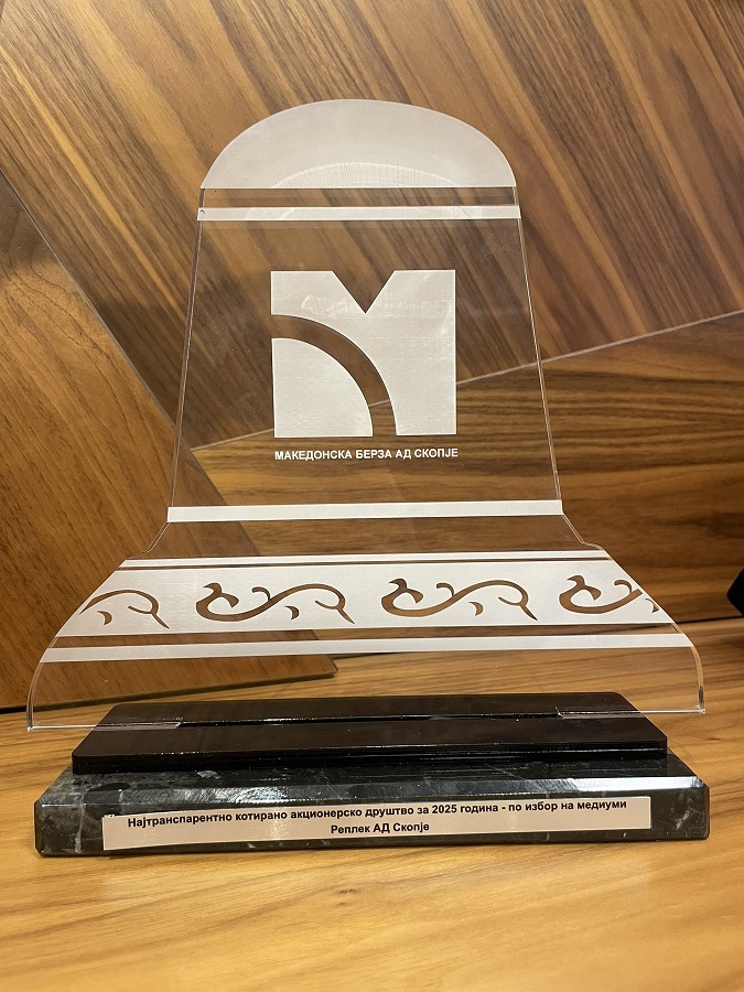 „Реплек АД Скопје“ годинава е добитник на престижната награда „Кристално ѕвоно“ за најтранспарентно котирано акционерско друштво, по избор на медиумите, што традиционално ја доделува Македонската берза за хартии од вредност. Ова признание се врачува на крајот на годината и ја означува доследната, отворена и квалитетна комуникација на компаниите котирани на берзата, како и високите стандарди на отчетност и транспарентност кон инвеститорите, регулаторот и јавноста.