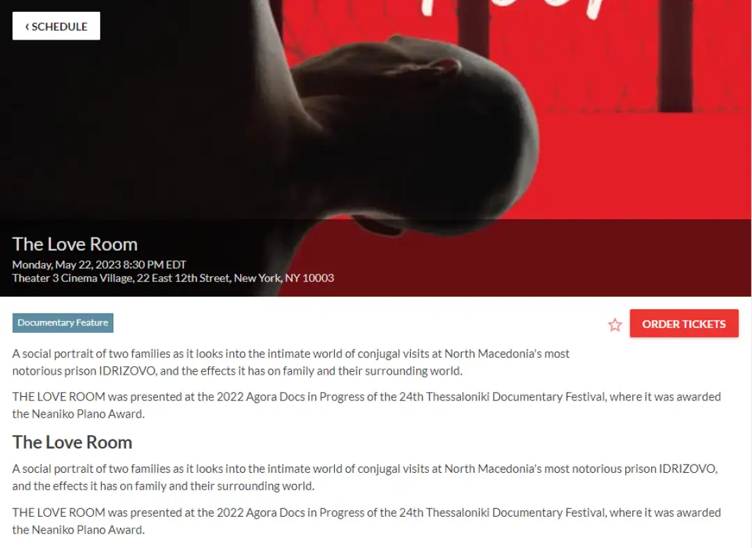 Филмот ќе се прикажува во киното Cinema Village, кое е едно од најстарите кина во Гринич Вилиџ на Менхетен, кое датира од 1963 година и е едно од најпрестижните функционални уметнички и независни кина кои функционираат во Њујорк.